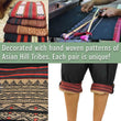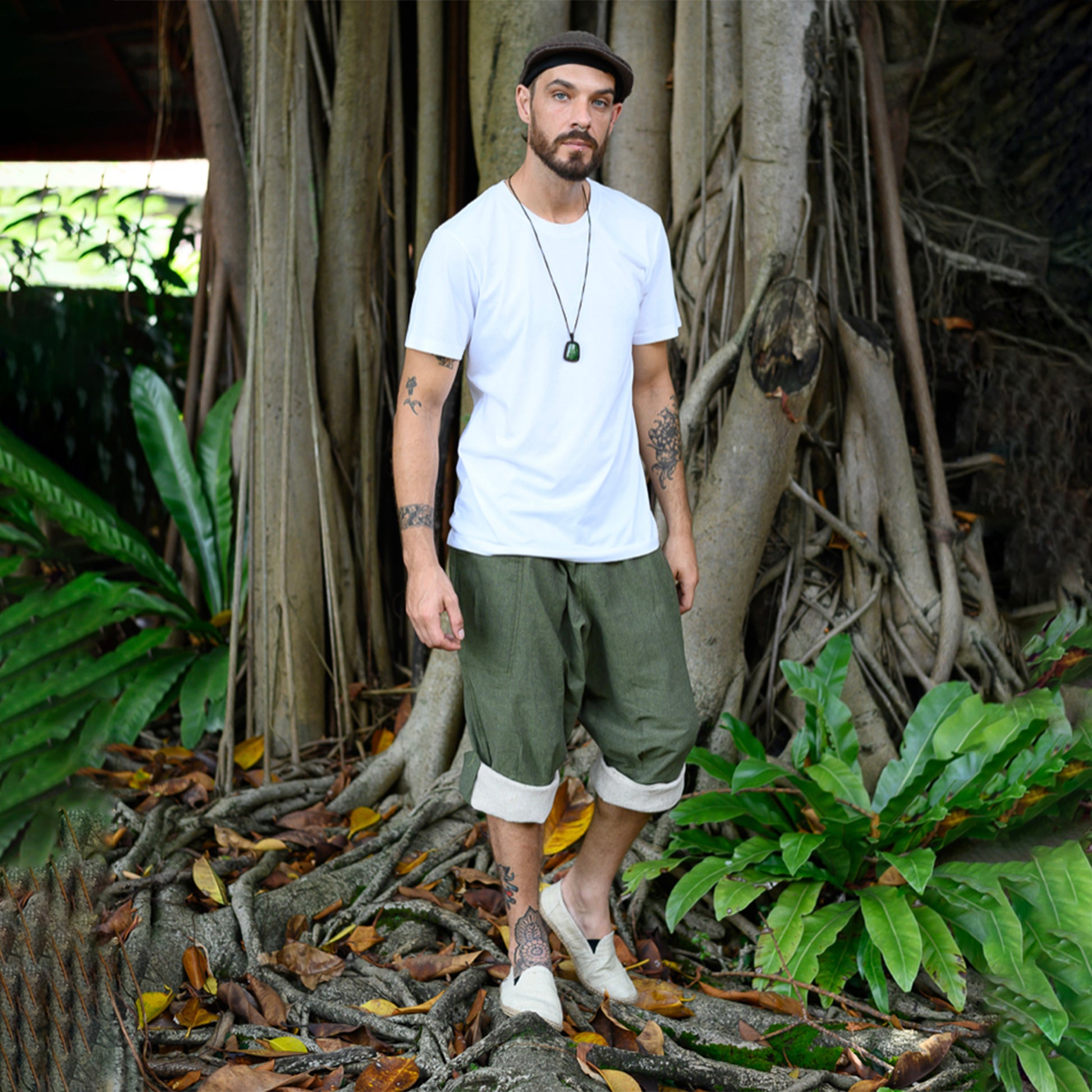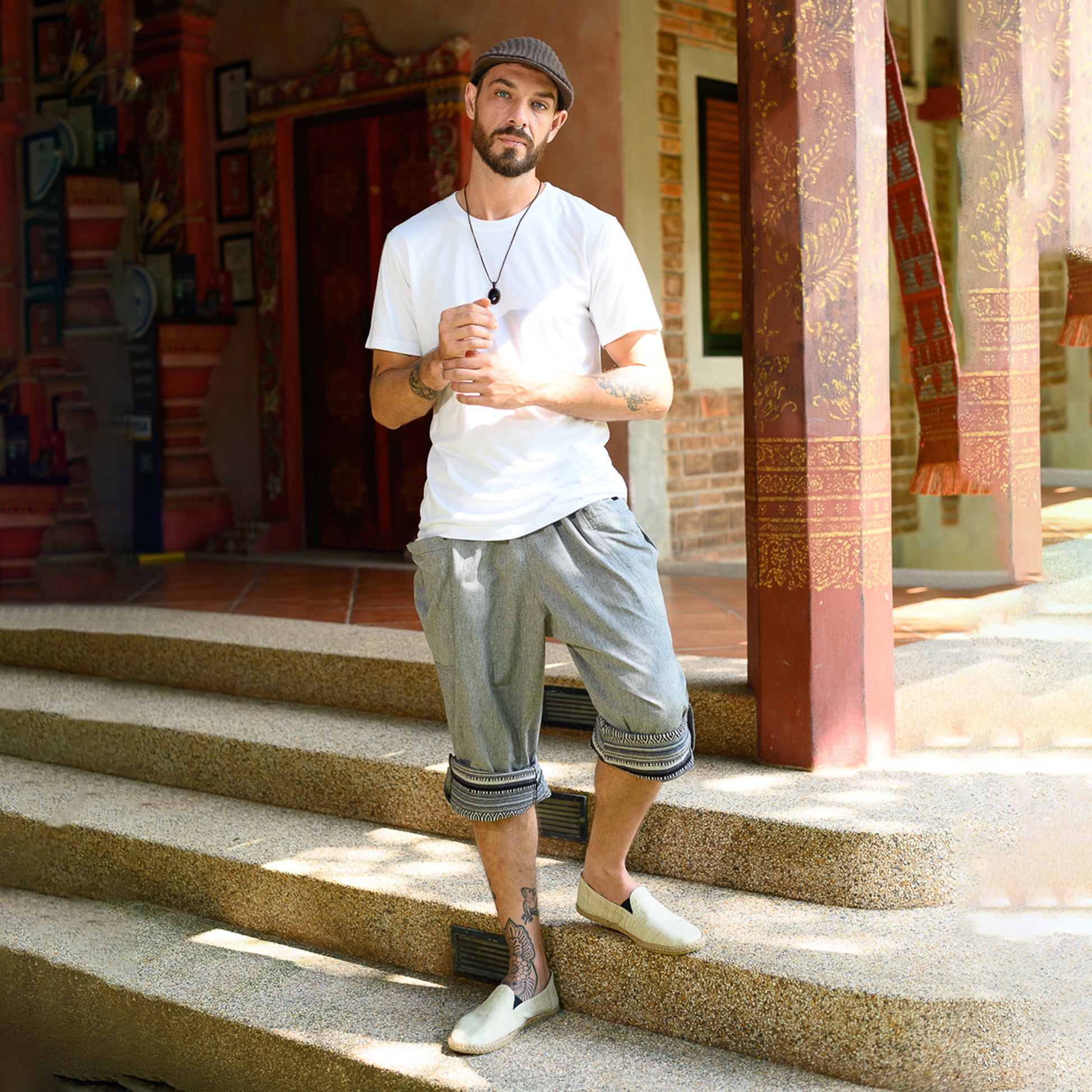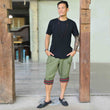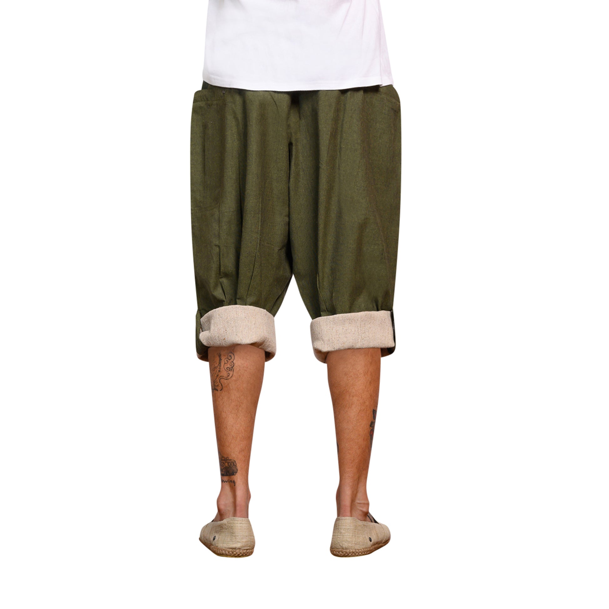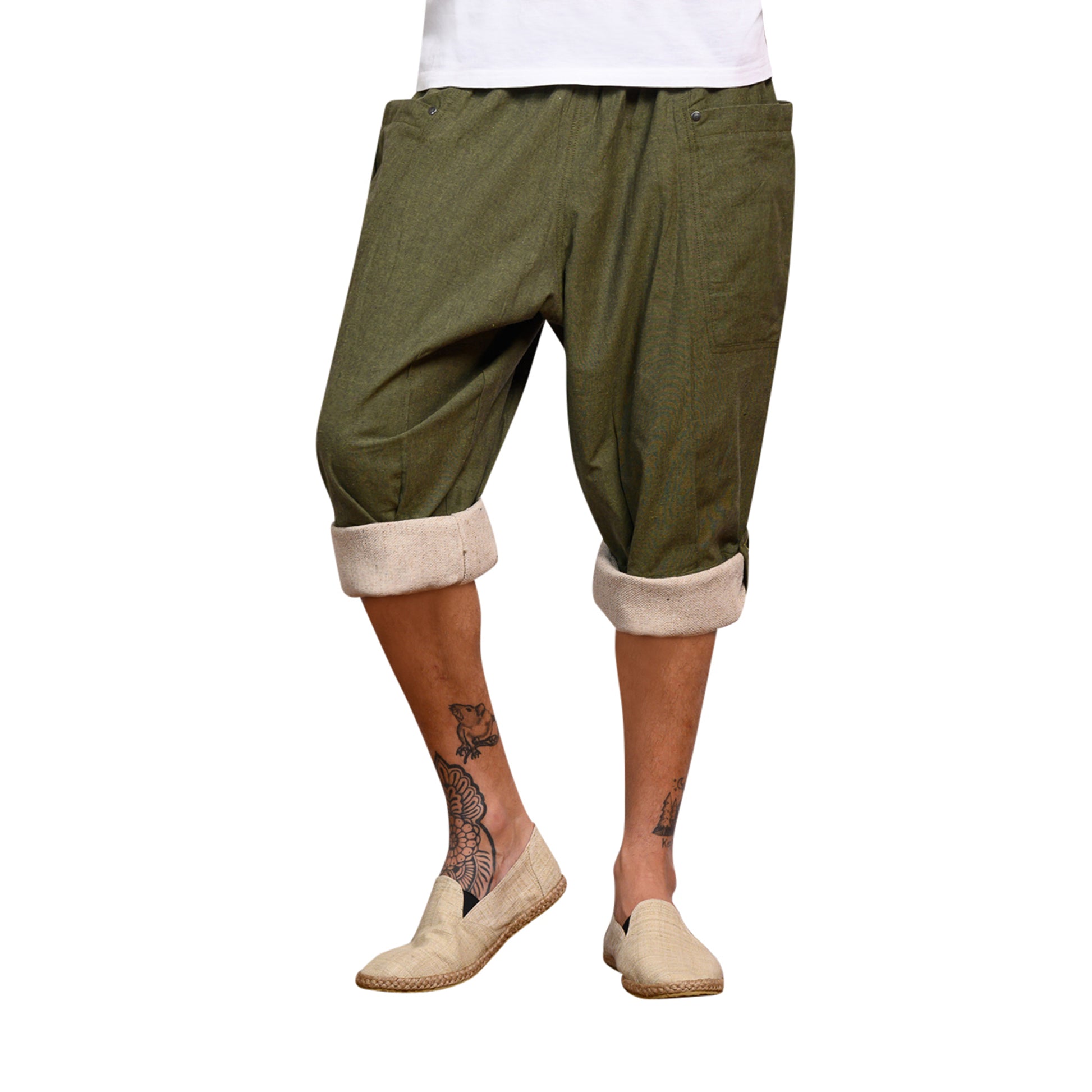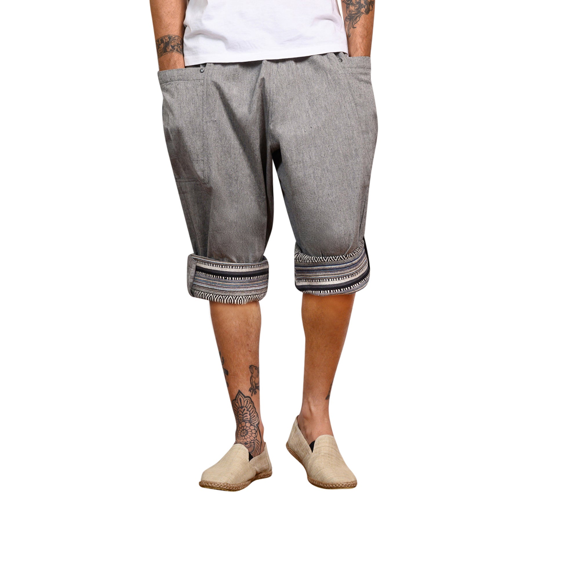 Short drop crotch harem pants for men with a comfortable cut and two large pockets on the sides. The cuffs of the cropped harem pants can be buttoned up to accentuate the hand woven ethnic patterns by the Asian Naga hill tribe. Note: The hill tribe pattern at the bottom of the pants may vary from model to model.
