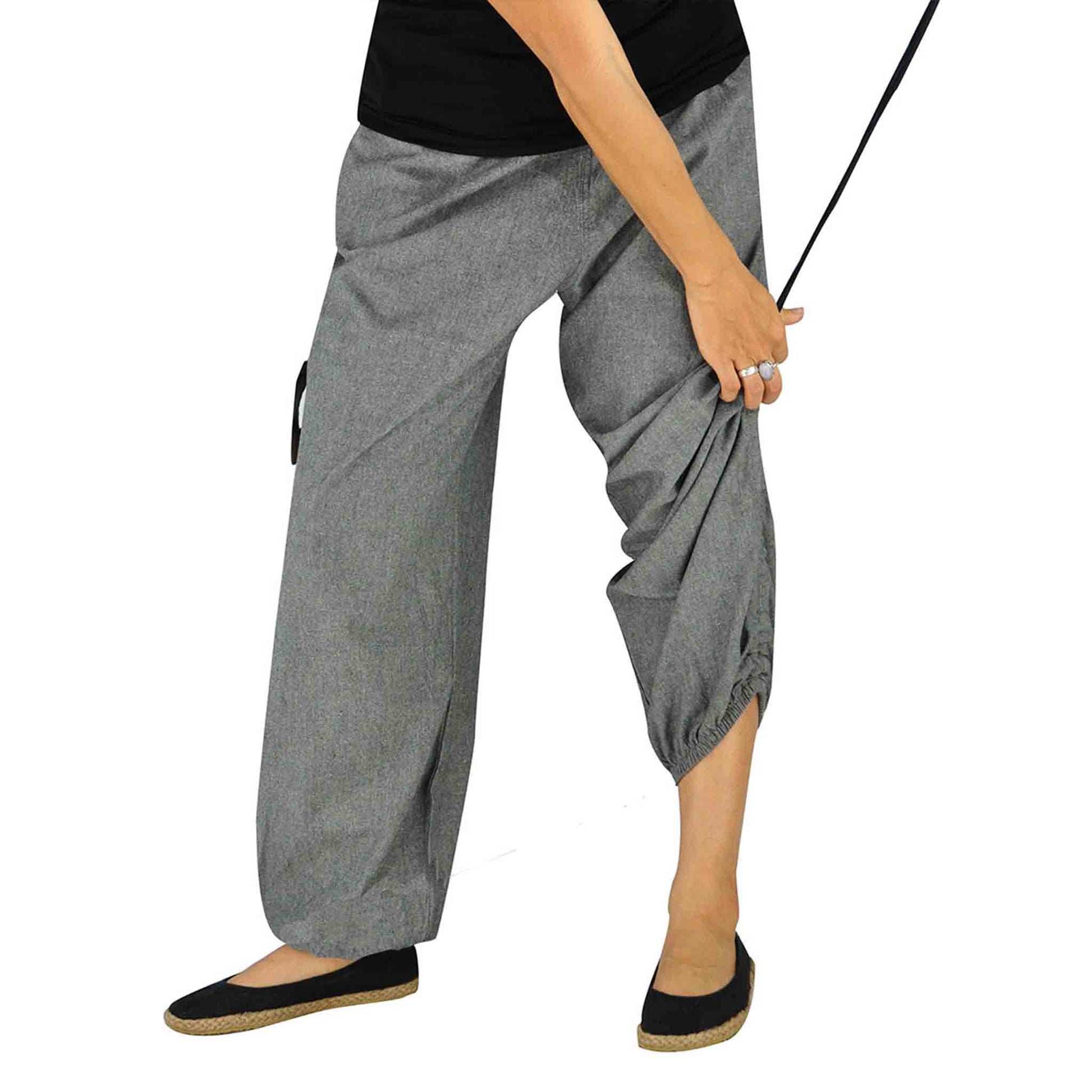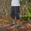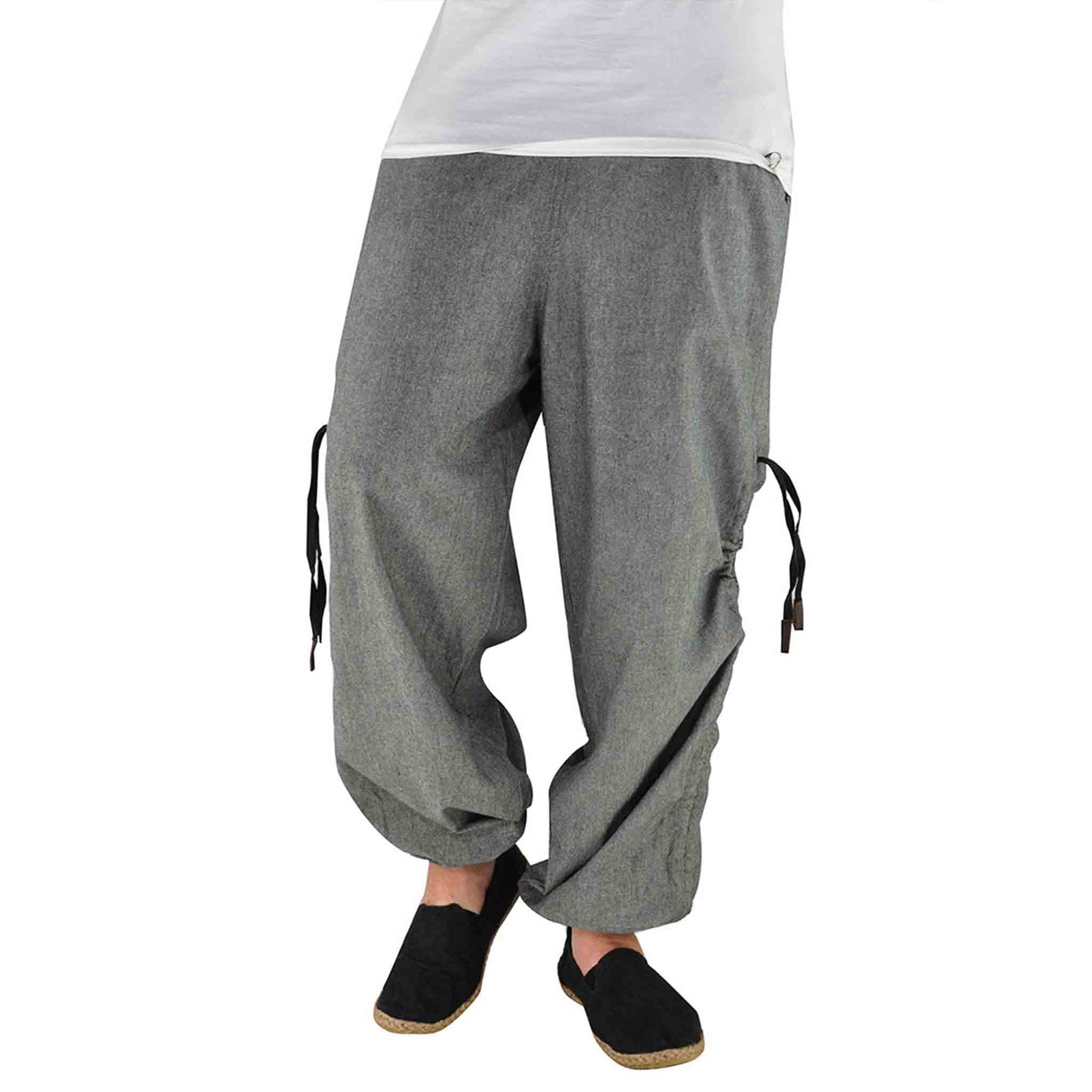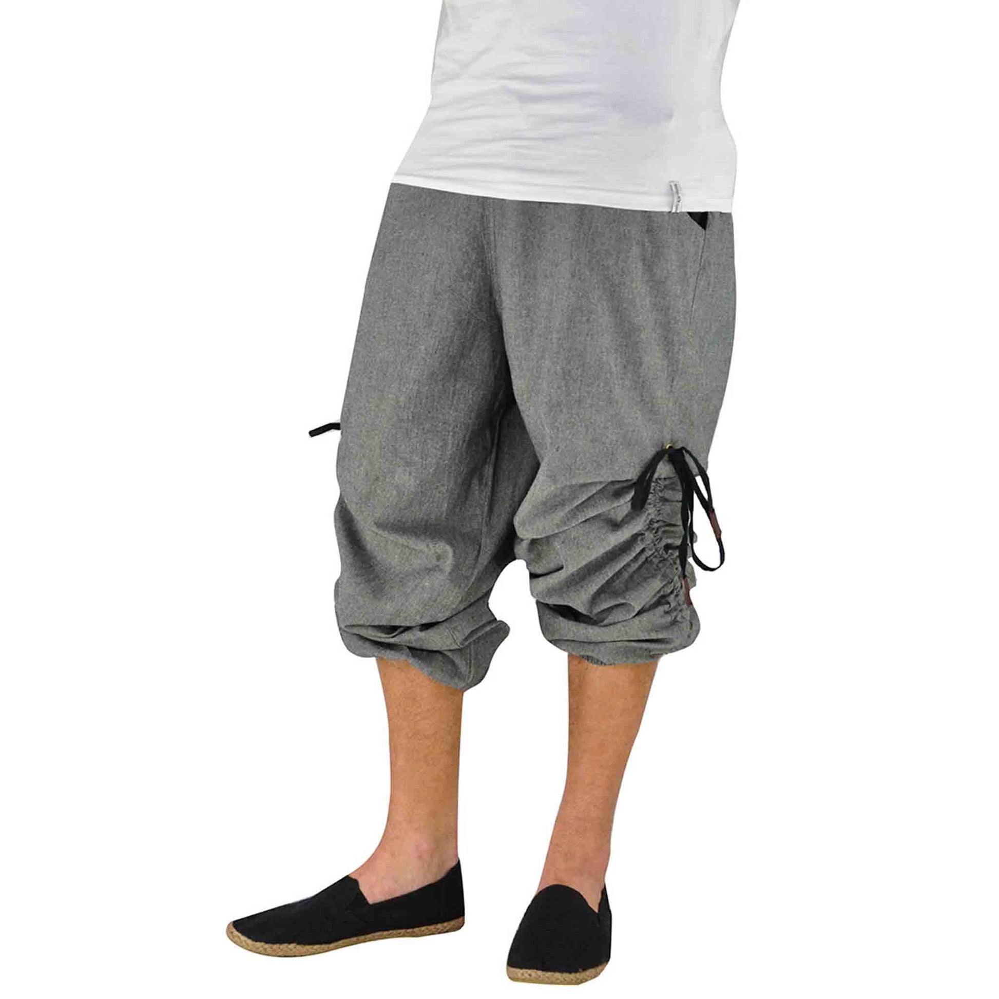 Wouldn’t it be convenient to have a pair of short and long hippie trousers at the same time? So even wearing long hippie pants you can easily dance through the streams by simply making them shorter... And similarly when it gets cooler you can simply lengthen your trousers, and brave the cold... How convenient that virblatt offers such an option! The harem pants for men and women are grey with black elements and a super practical alternative garment. The elastic waistband of the aladdin pants ensures a very comfortable fit. The practical side pockets are contrasting in colour and as a special highlight the drop crotch pants can be gathered upwards with a lacing at the side and worn as harem trousers short or long harem pants. How practical!