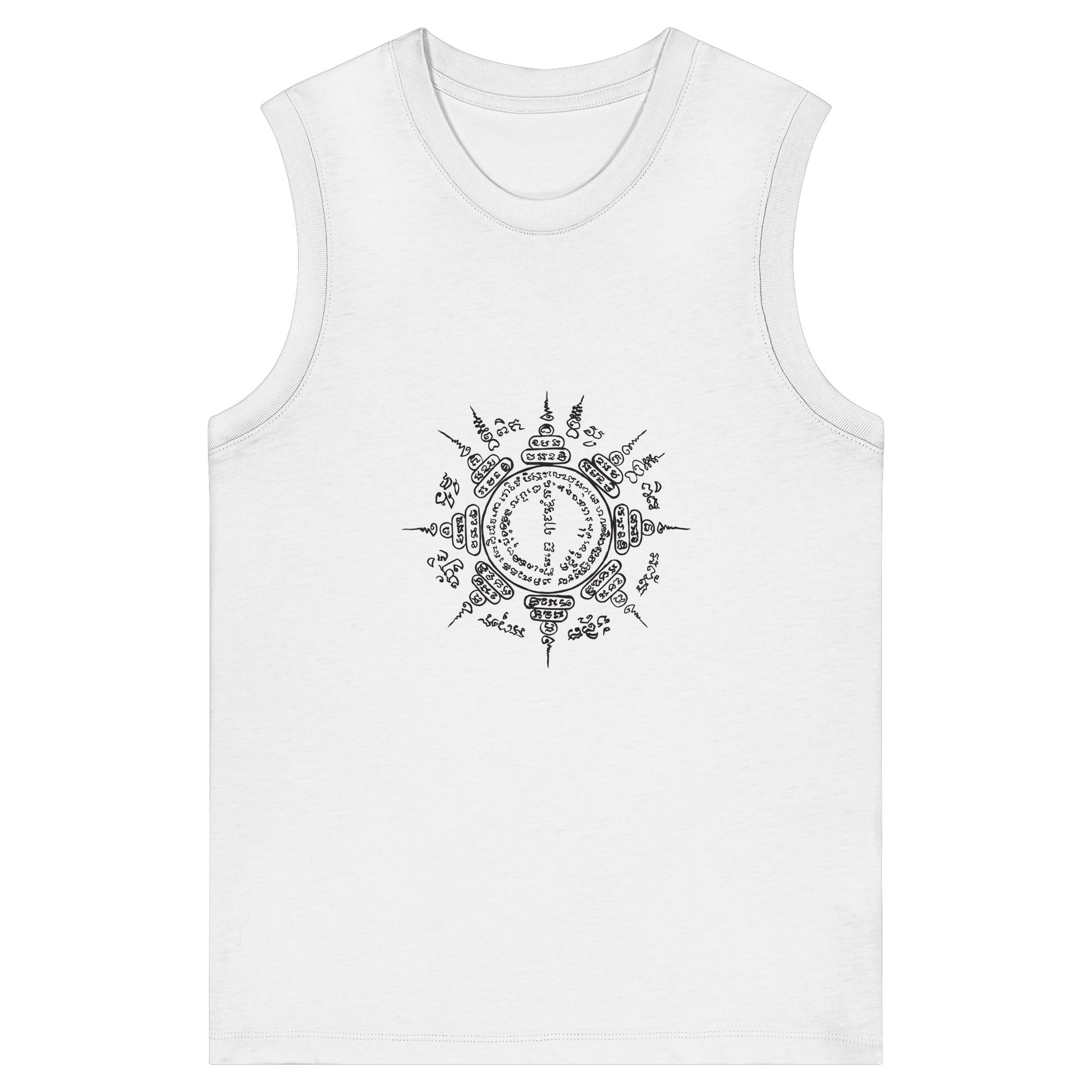 This loosely cut top brings spiritual depth to your wardrobe. The hand-painted Paed Tidt print shows the iconic Sak Yant with eight directions of the sky – a powerful protective symbol meant to guard travelers against negative influences and dangers.
