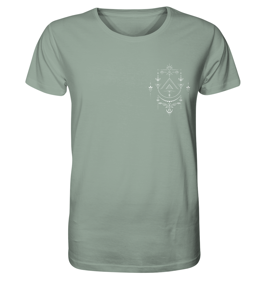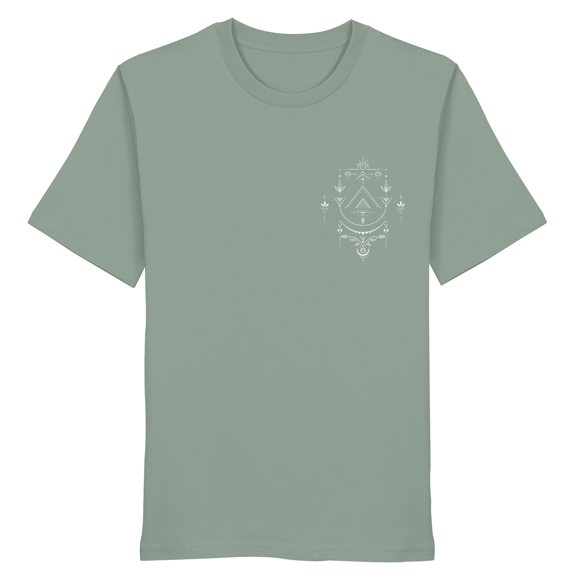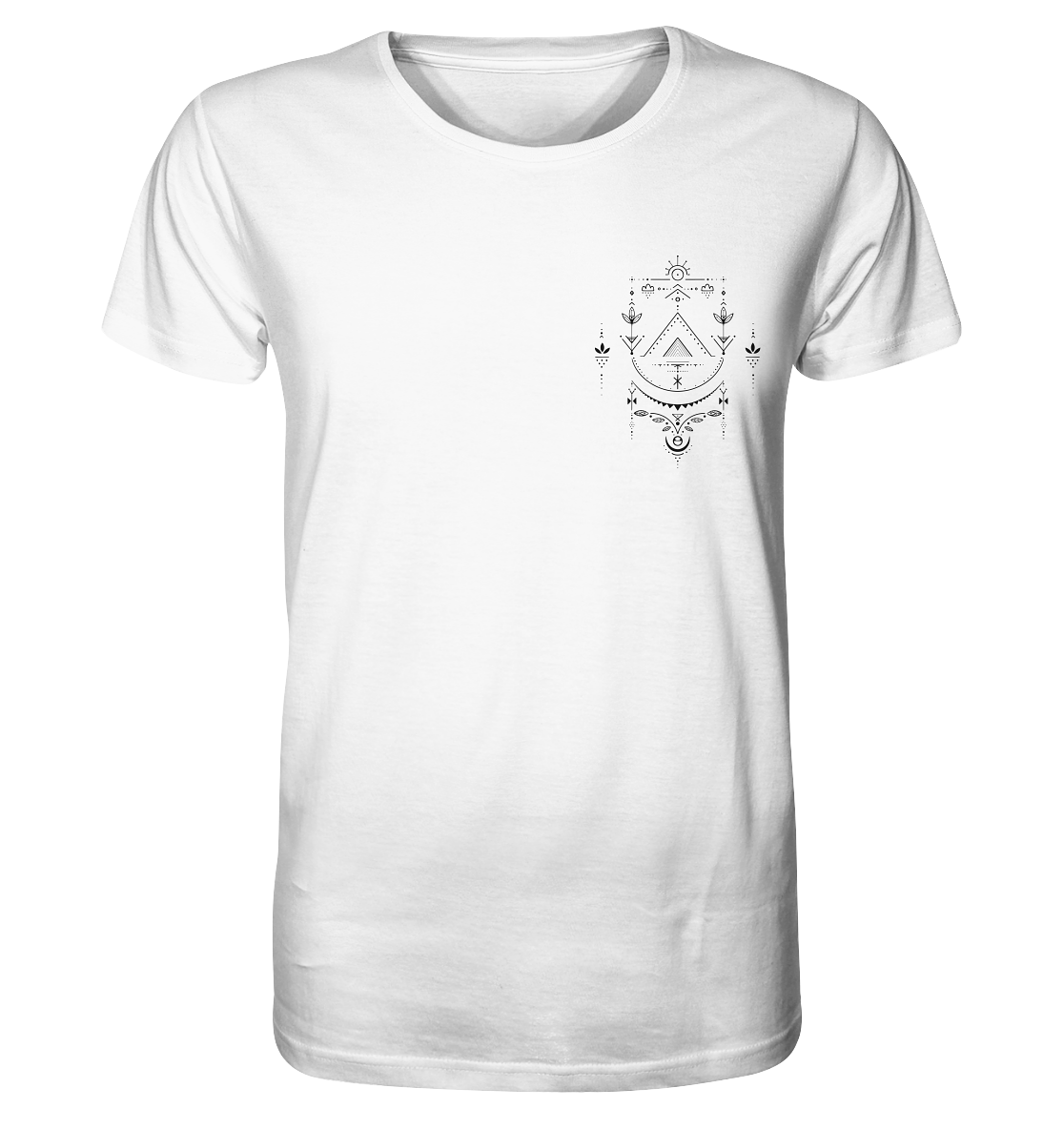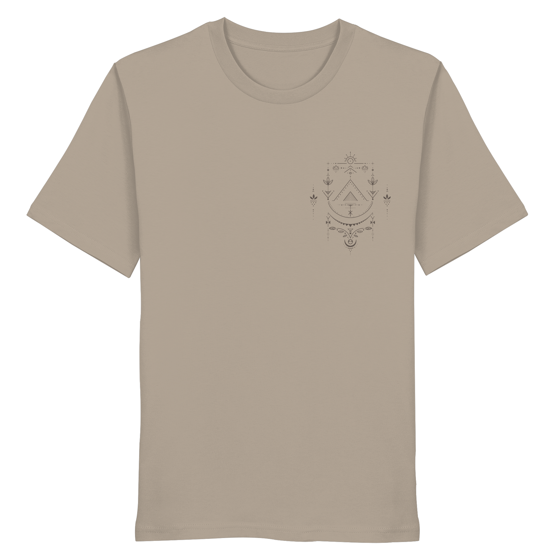 This T-shirt shows that expression doesn't have to be loud. The hand-drawn design on the chest pocket comes from our friend and artist Emily, whose delicate dotwork art continually inspires us. With her handwriting, she combines geometric shapes with spiritual symbolism – a quiet statement for clarity, presence, and inner alignment.