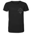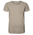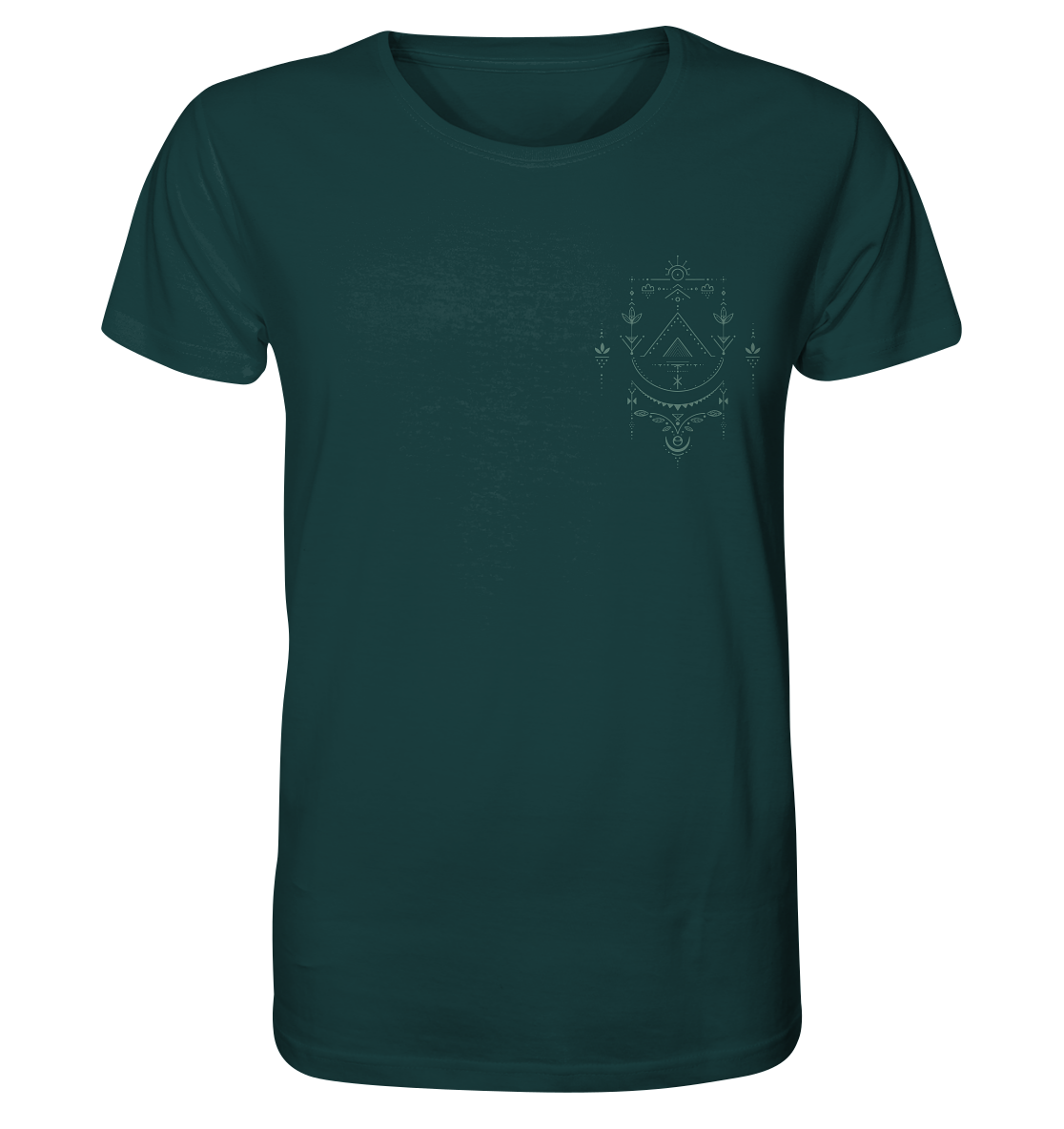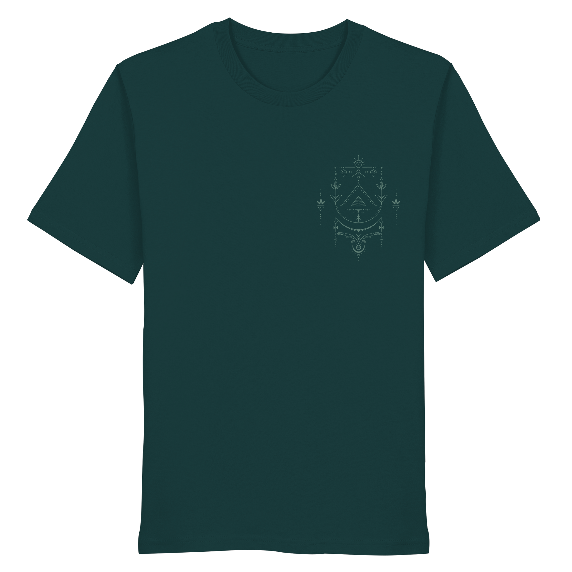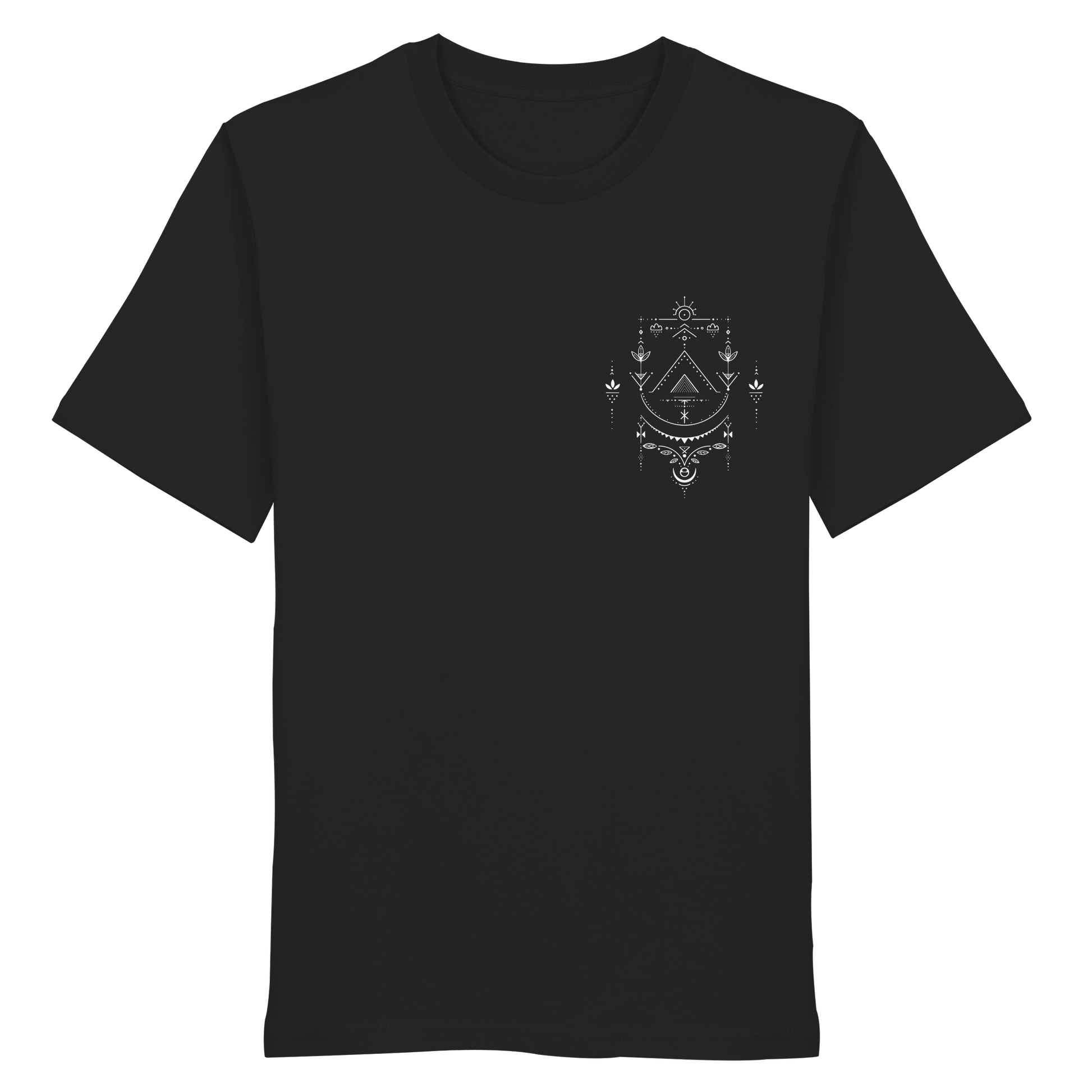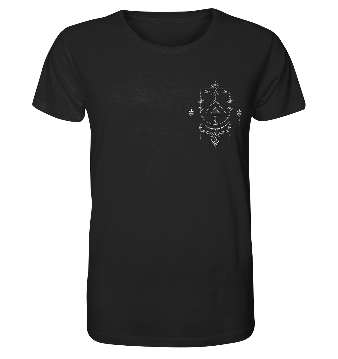 This T-shirt shows that expression doesn't have to be loud. The hand-drawn design on the chest pocket comes from our friend and artist Emily, whose delicate dotwork art continually inspires us. With her handwriting, she combines geometric shapes with spiritual symbolism – a quiet statement for clarity, presence, and inner alignment.