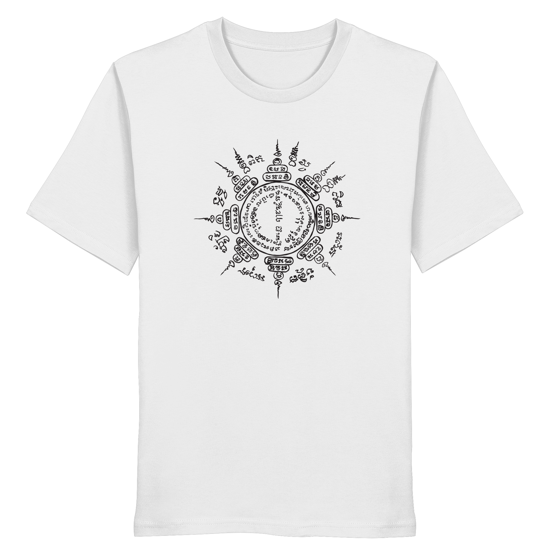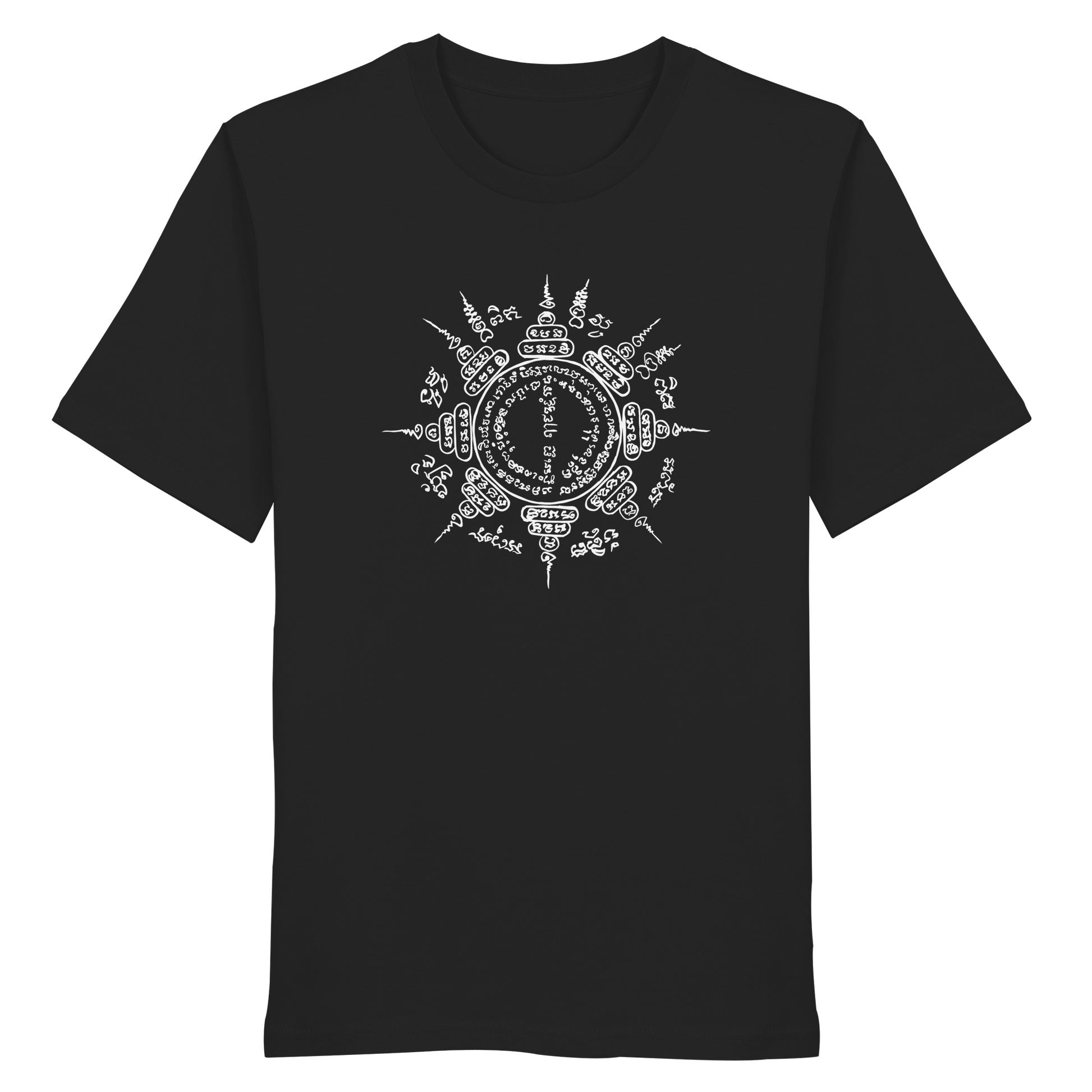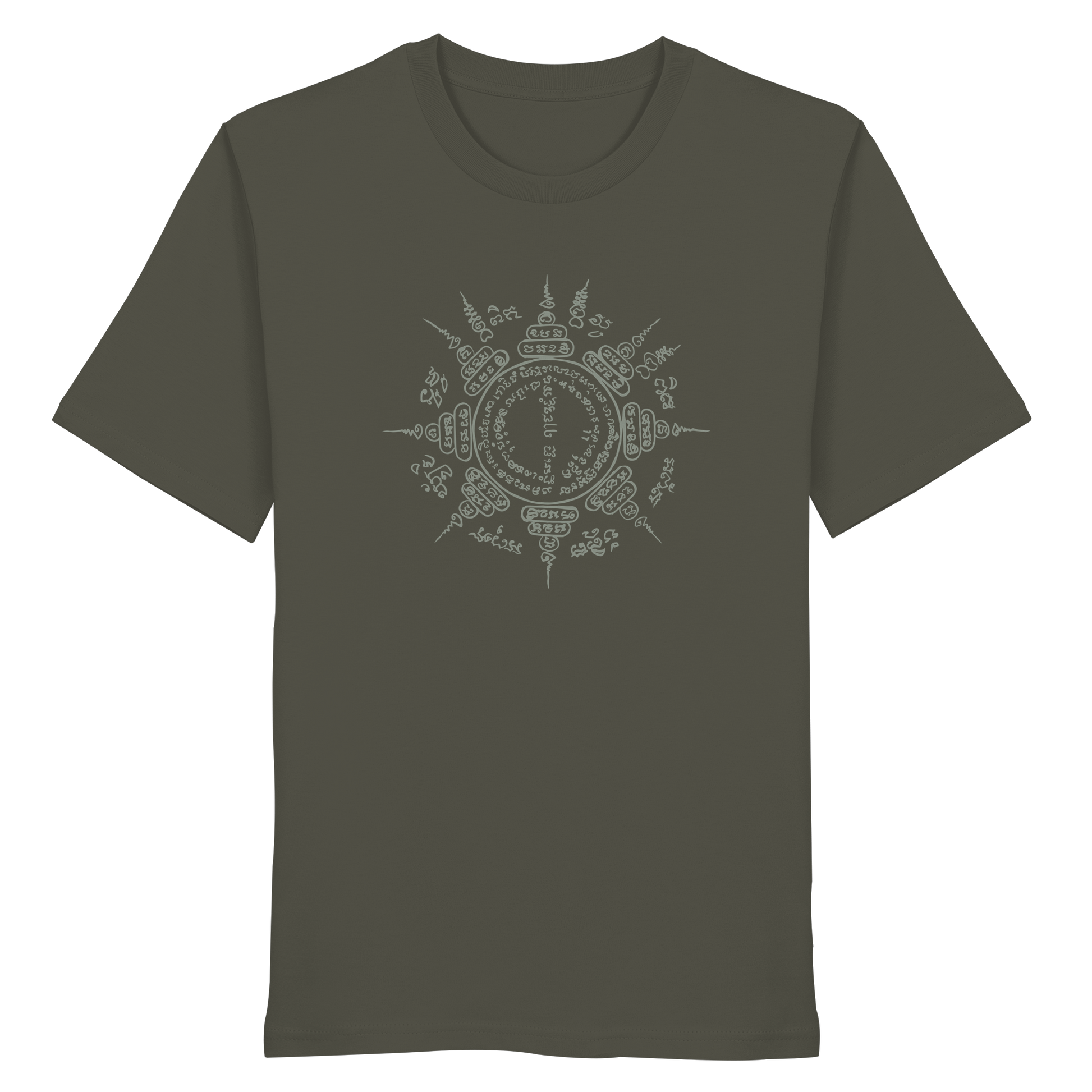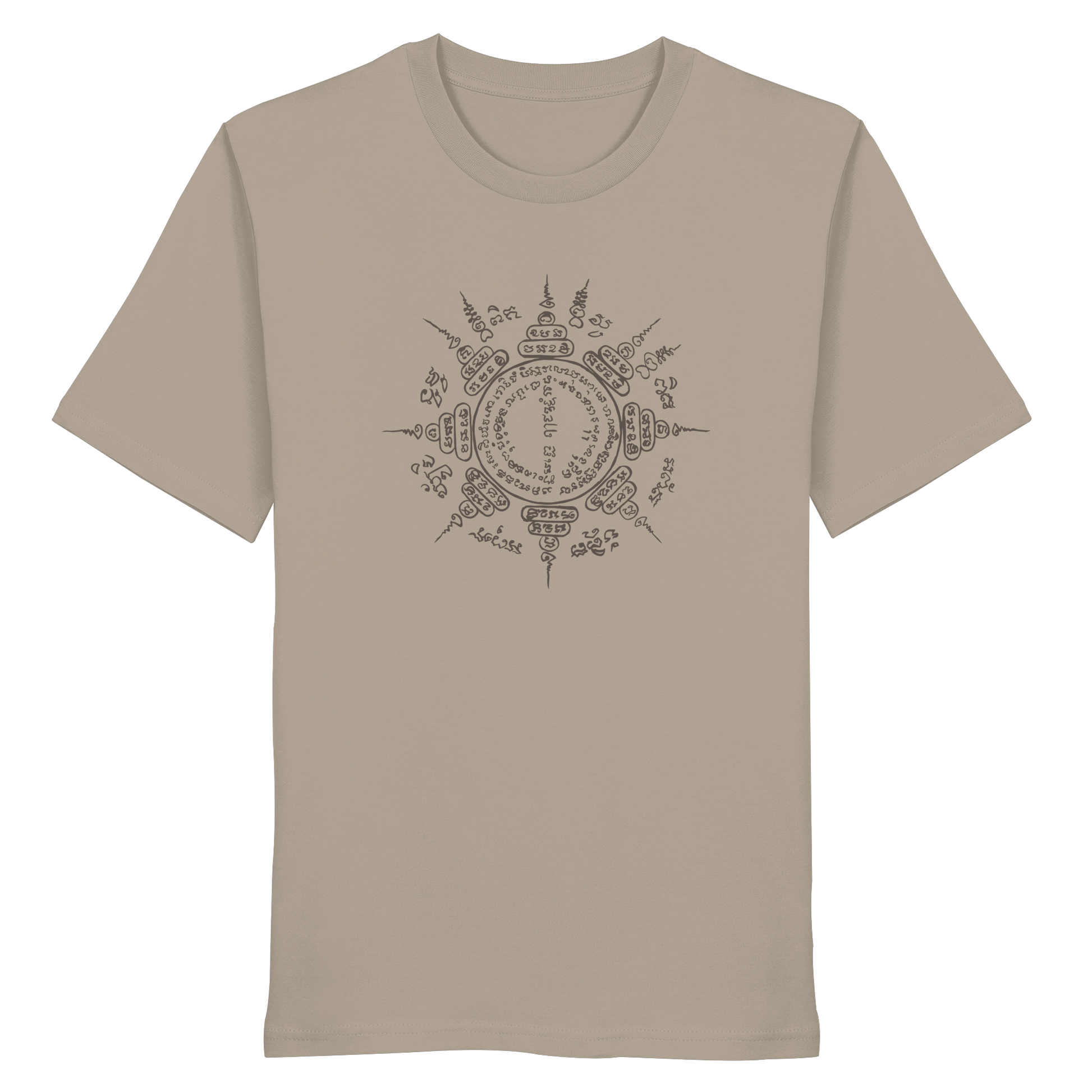 This shirt combines powerful symbolism with natural colors and sustainable wearing comfort. The design is based on a hand-painted Paed Tidt Yantra – a sacred protective symbol from the Thai Sak Yant tradition, which is said to bring protection and balance in all directions.