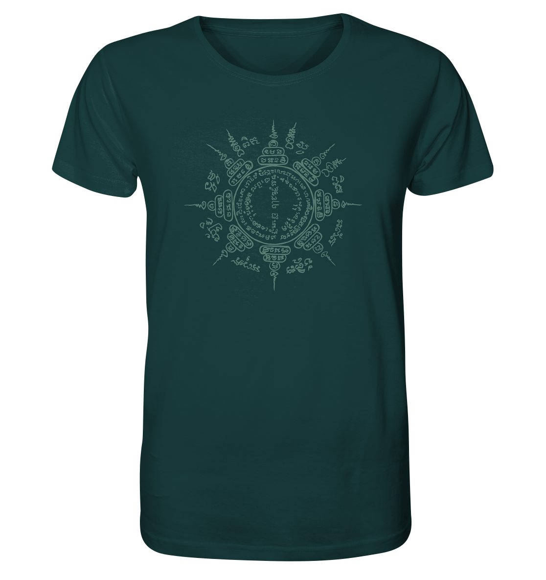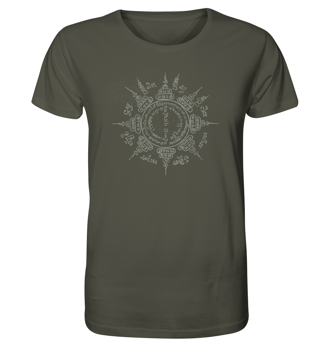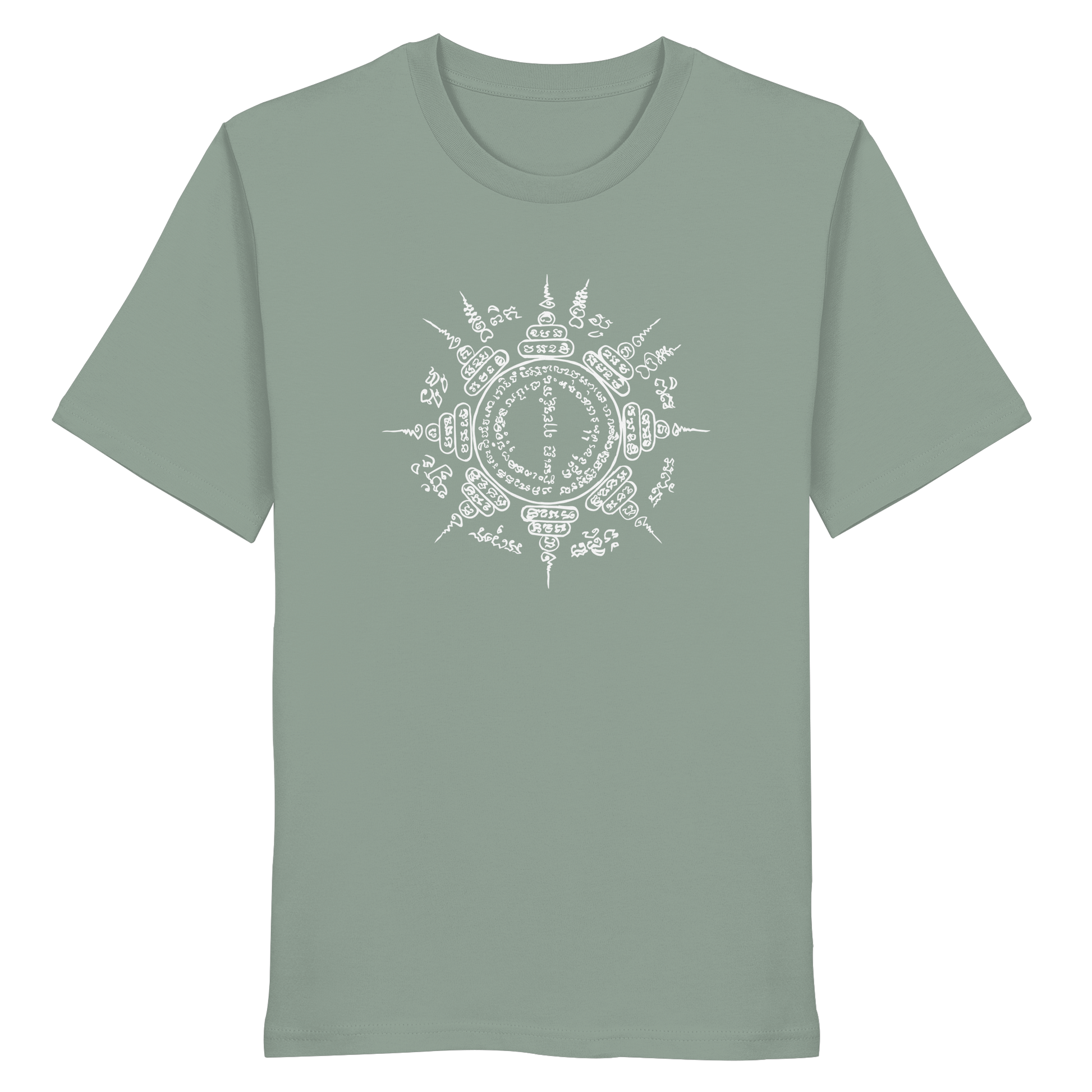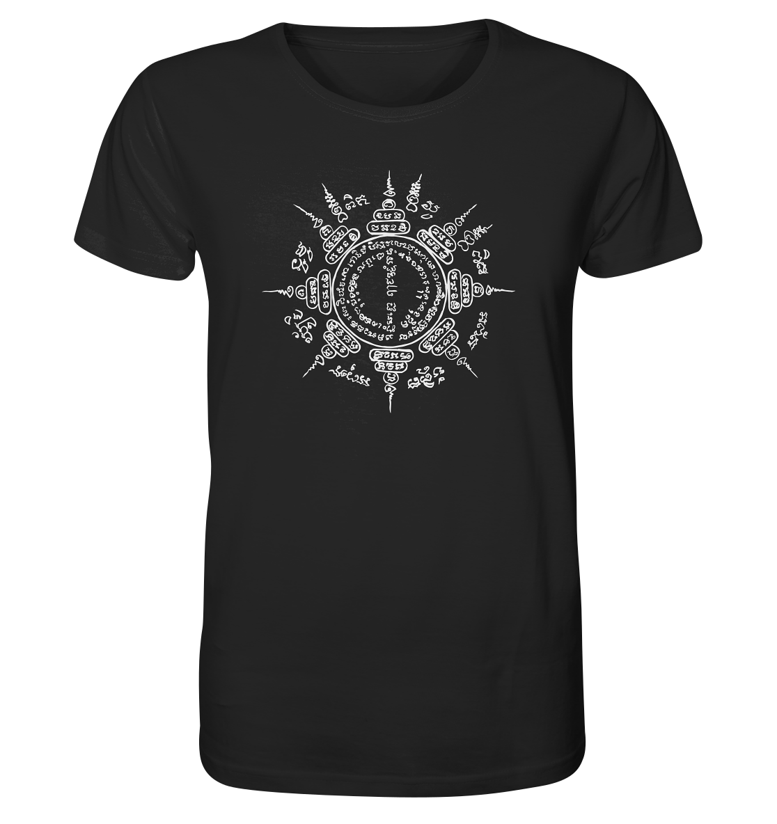 This shirt combines powerful symbolism with natural colors and sustainable wearing comfort. The design is based on a hand-painted Paed Tidt Yantra – a sacred protective symbol from the Thai Sak Yant tradition, which is said to bring protection and balance in all directions.